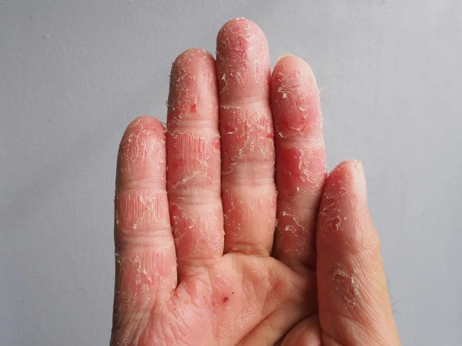 这是手部脱皮最常见的一大类疾病。很多患者会伴有身体其他部位的类似皮损,表现为对称性的红斑、鳞屑,急性发作有点儿类似手癣,可能会更肿,甚至有渗出,慢性反复发作则会出现局部皮肤的肥厚浸润,甚至苔藓化,手掌都会变厚变硬。最大的问题是瘙痒难忍,而且复发率太高,就像个狗皮膏药黏住你。至于原因,很难明确,而且因人而异,有的可能是季节相关,而有的可能跟局部接触有关。治疗方法因人而异,因病情不同而异,总之,得在医生指导下正确用药[1]。