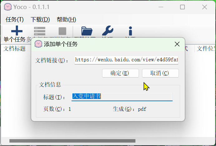 Yoco 是一款单文件软件,大小还不到 10MB,直接运行打开即可使用。操作方便快捷,只需要点击单个任务(同时下载任务仅为 1 个,多任务调度开发耗时费力),然后复制粘贴文档链接(浏览器中的完整网址)即可下载,文件默认保存在桌面哦,下载的文件默认为可复制文字的pdf。