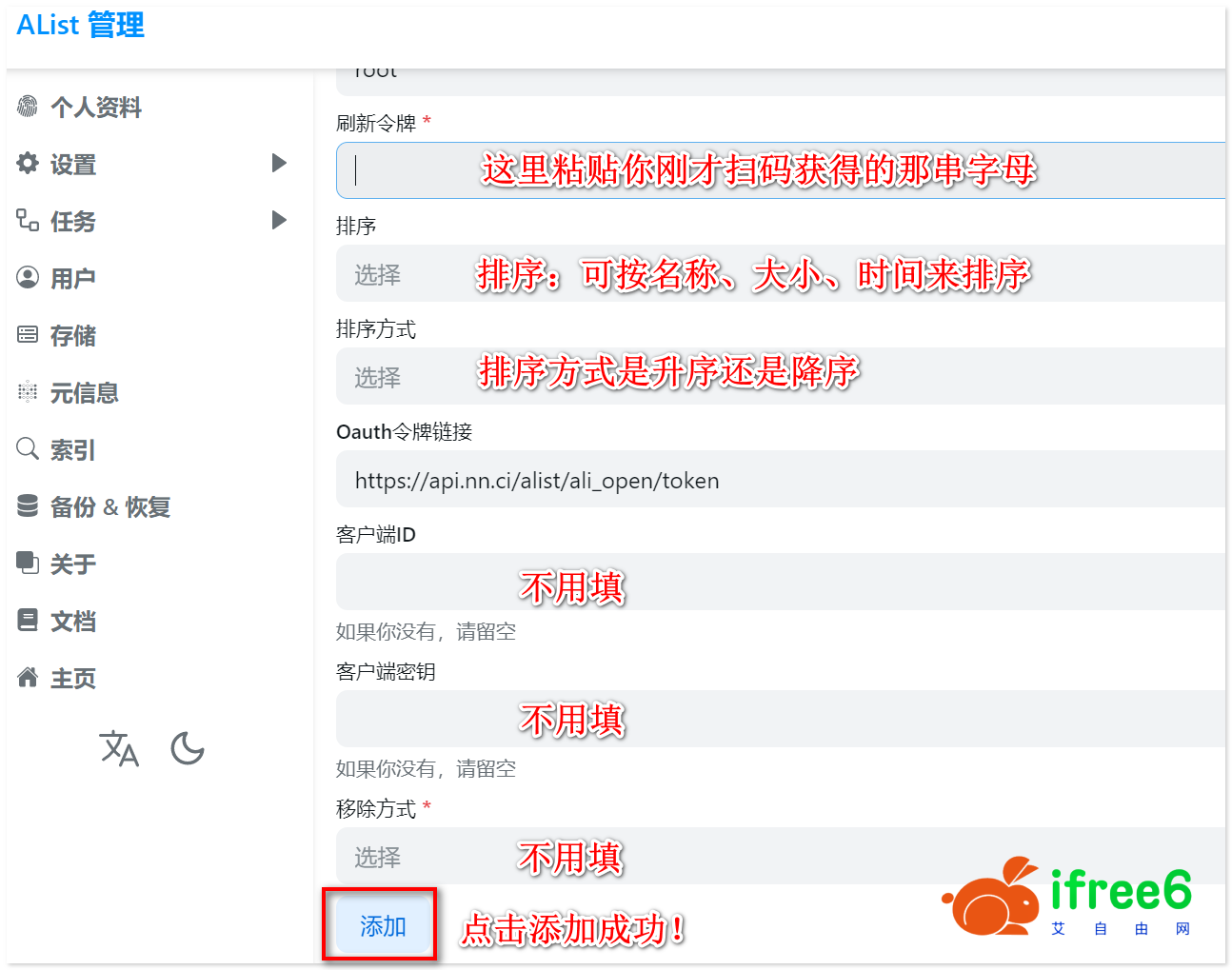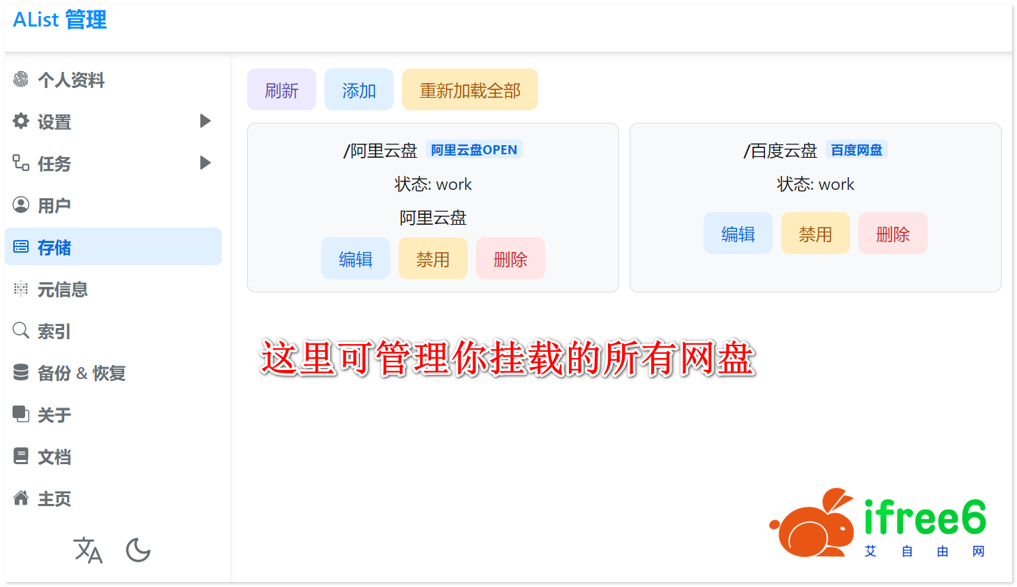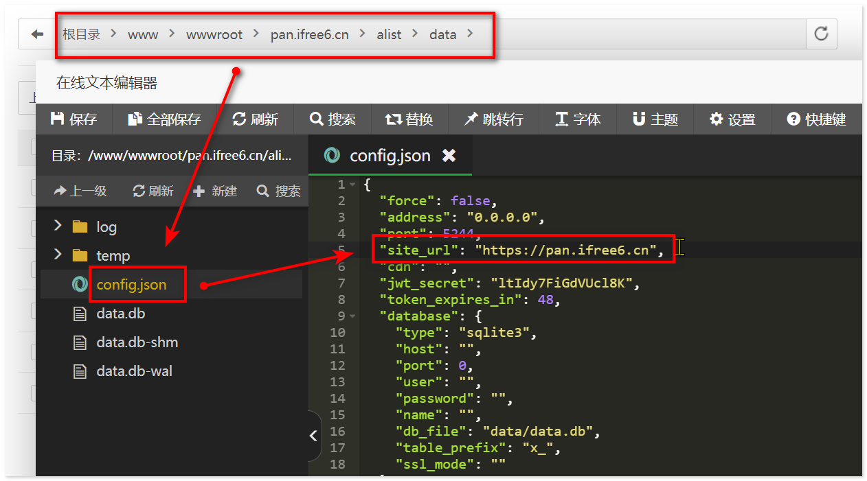配置文件路径:/www/wwwroot/pan.ifree6.cn/alist/data/config.json