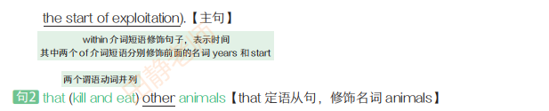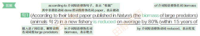 【句1】主句:According to their latest paper published inNature, the biomass of large predators (animals...) in a new fishery is reduced on average by 80% within 15 years of the start of exploitation.
