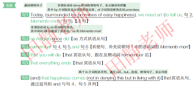 【句1】主句:Today, surrounded by promises of easy happiness, we need art to tell us, ..., Memento mori: ...