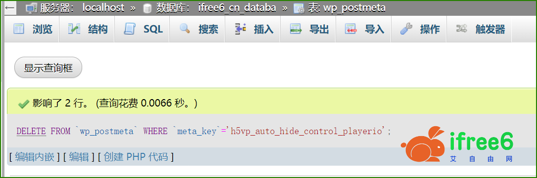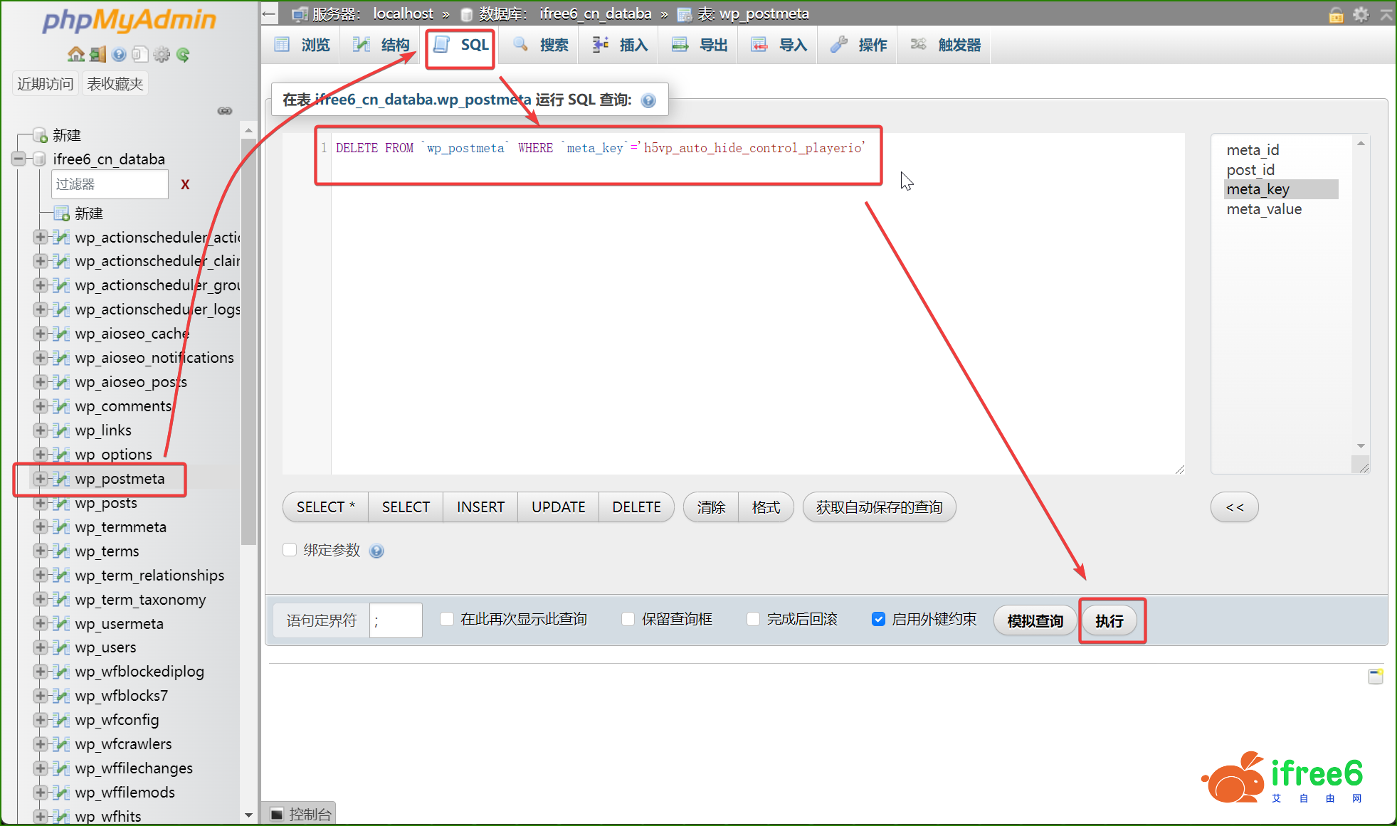 点击数据库左侧的加号,可以展开。找到名字为“wp_postmeta”的数据表,单击。在SQL菜单下,输入以下类似代码: