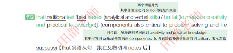 【句2】宾语从句:that traditional tests best assess analytical and verbal skills but fail to measure creativity and practical knowledge, components also critical to problem solving and life success.