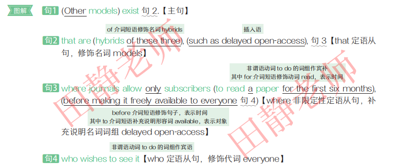 【句2】定语从句(修饰名词models):that are hybrids of these three, such as delayed open-access,
