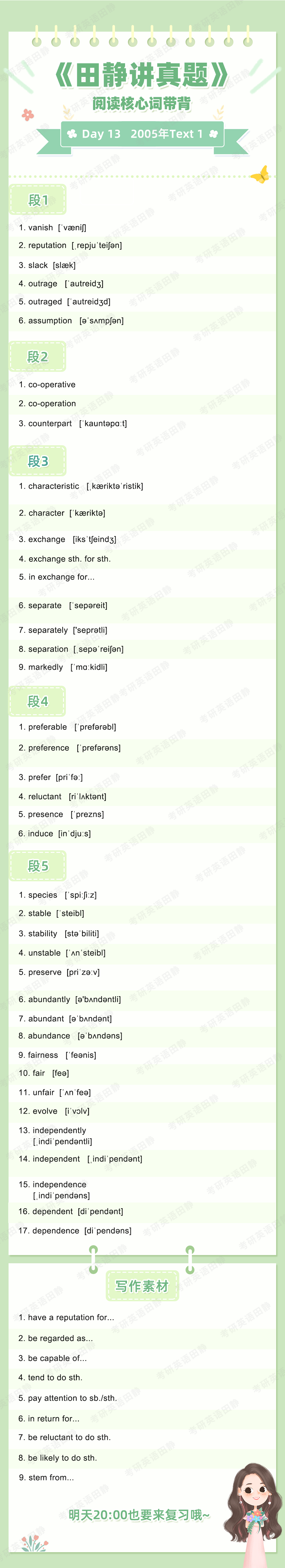 先复盘再学习,看看昨天的核心词带背都记住了吗,跟着静姐一起自测一下吧,没记住的单词记得标记出来📌,和今天新的单词一起背诵呀~