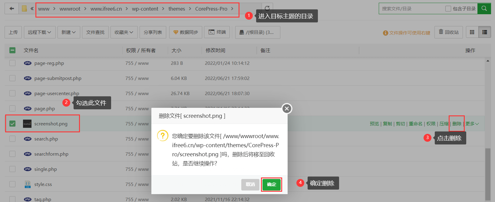 找到目标主题目录下的 “screenshot.png”文件,将他删除。然后上传你刚才准备好的新图片。