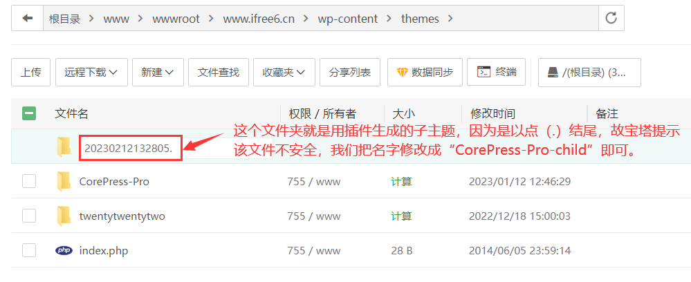 登录宝塔面板,--> 网站 --> 主题目录(你的域名/wp-content/themes/主题名)