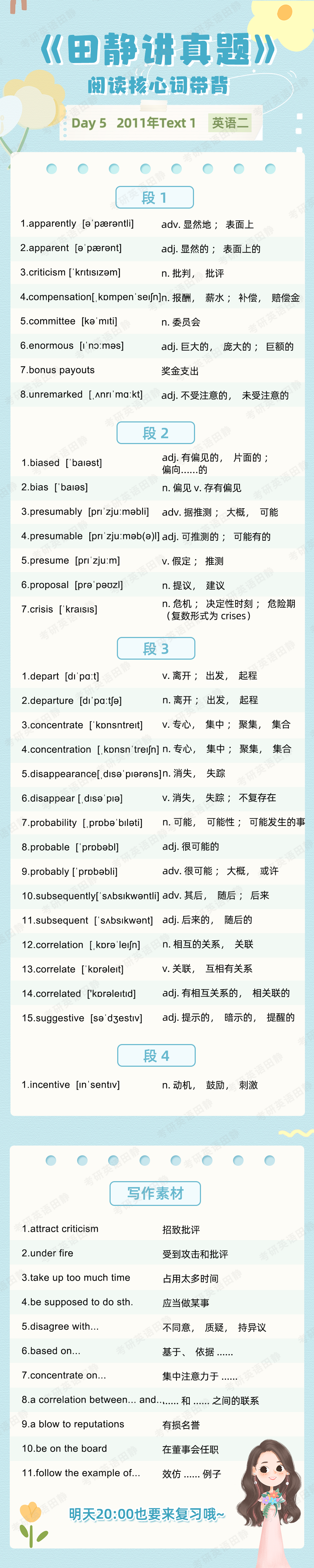 先复盘再学习,看看昨天的核心词带背都记住了吗,跟着静姐一起自测一下吧,没记住的单词记得标记出来📌,和今天新的单词一起背诵呀~