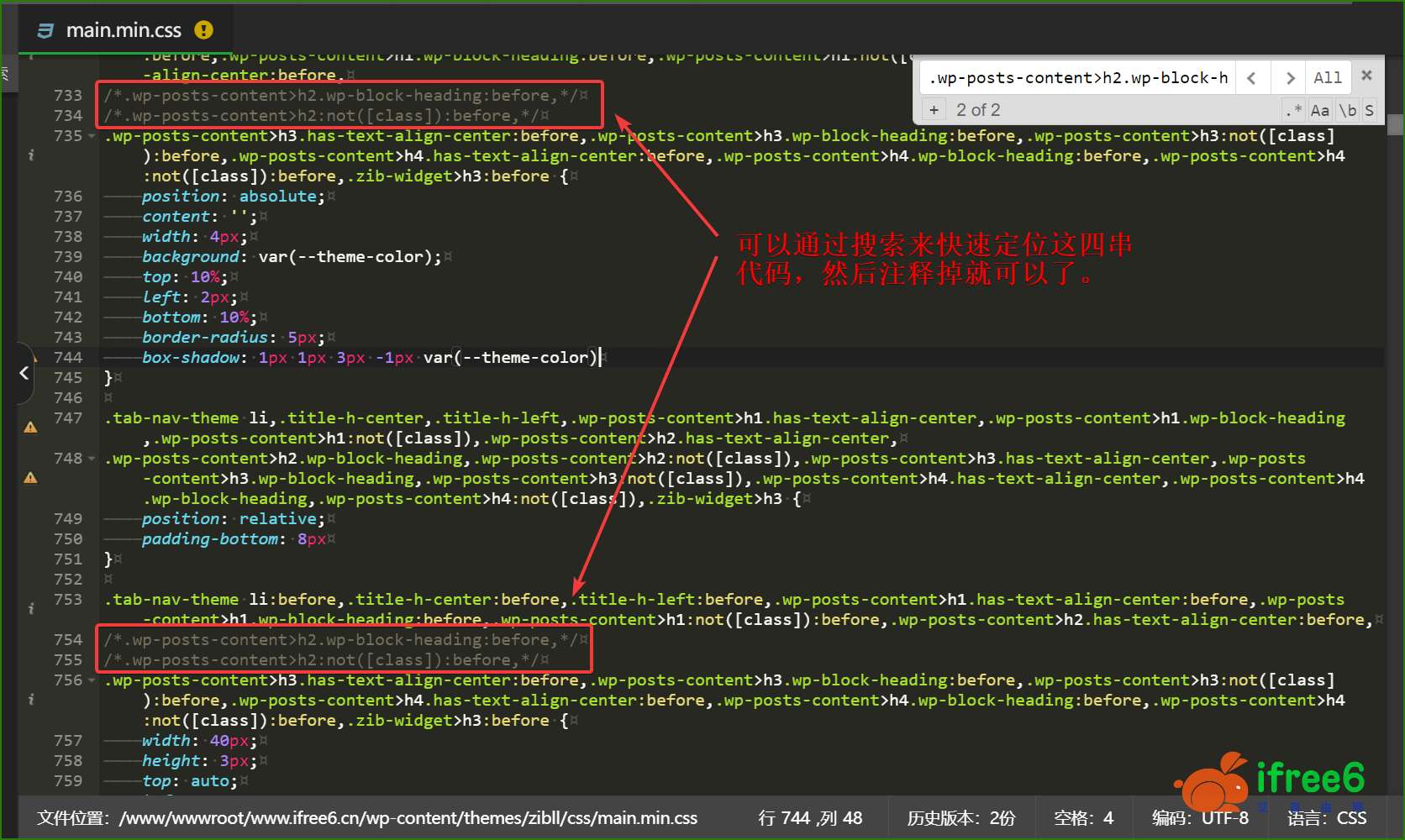 1. 前往网站服务器后台(如“宝塔”),找到“/www/wwwroot/你的域名/wp-content/themes/zibll/css/main.min.css”文件,删除(或注释)如下选择器代码(不是具体的样式代码):