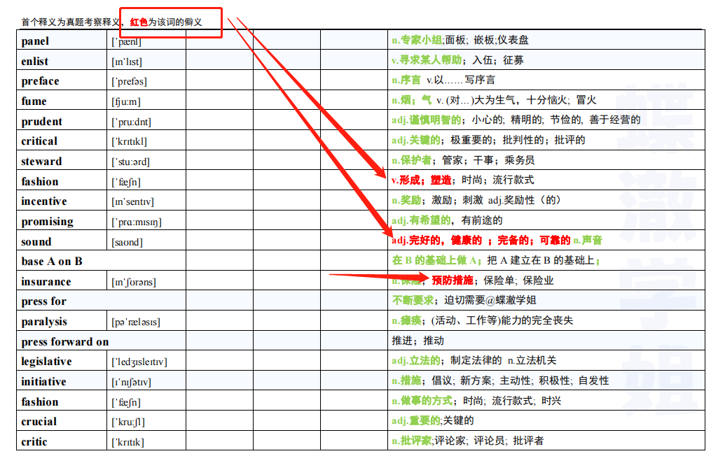 第一个绿色标注的就是真题考过的意思,一轮背诵优先背它,肯定不吃亏。ps:词表是带背营专属噢~