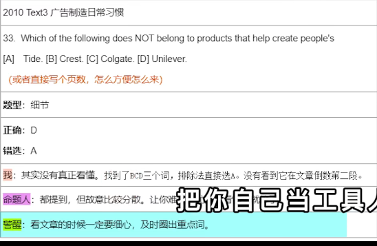 同理,对句子也要做到精细化。凡是不理解的,都要运用曾经学过的分析方法搞清楚。尤其是答案定位句,做错了,不就是因为没看懂它吗?