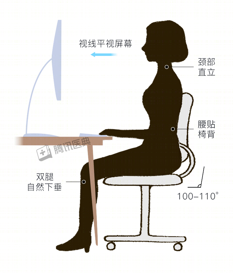3. 脊柱应与椅背平行,椅背应稍微倾斜,大约呈100-110°角,这样坐着工作的时候,背部可以得到有效支撑。