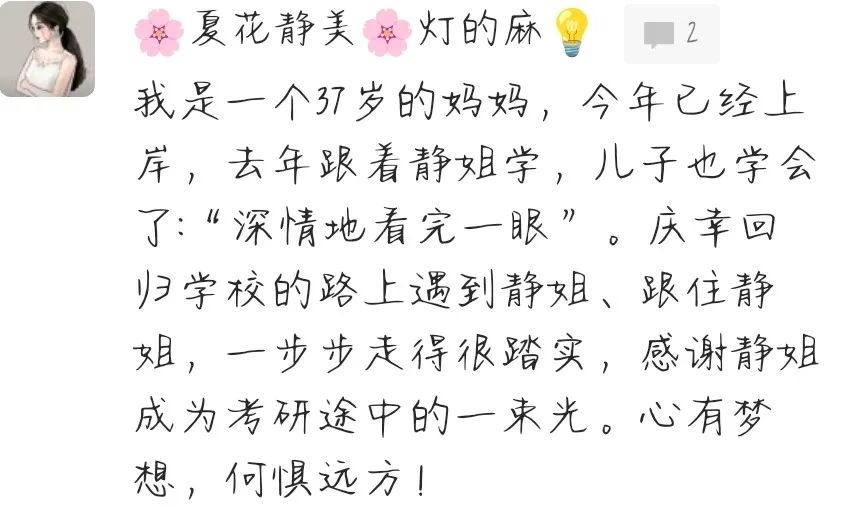 其实每年都会有很多在职的、大龄的、宝妈跟着静姐学习,他们默默地努力、悄悄地蜕变,从来都不抱怨大环境。只会用自己的方式去克服一切阻碍,我知道他们的时候都是他们已经上岸的时候。所以亲爱的田田圈们,未来纵使有再多未知,心中纵使有再多的彷徨。眼中纵使有再多的疑虑和担忧,把握好当下才是破除一切迷障的钥匙🔑