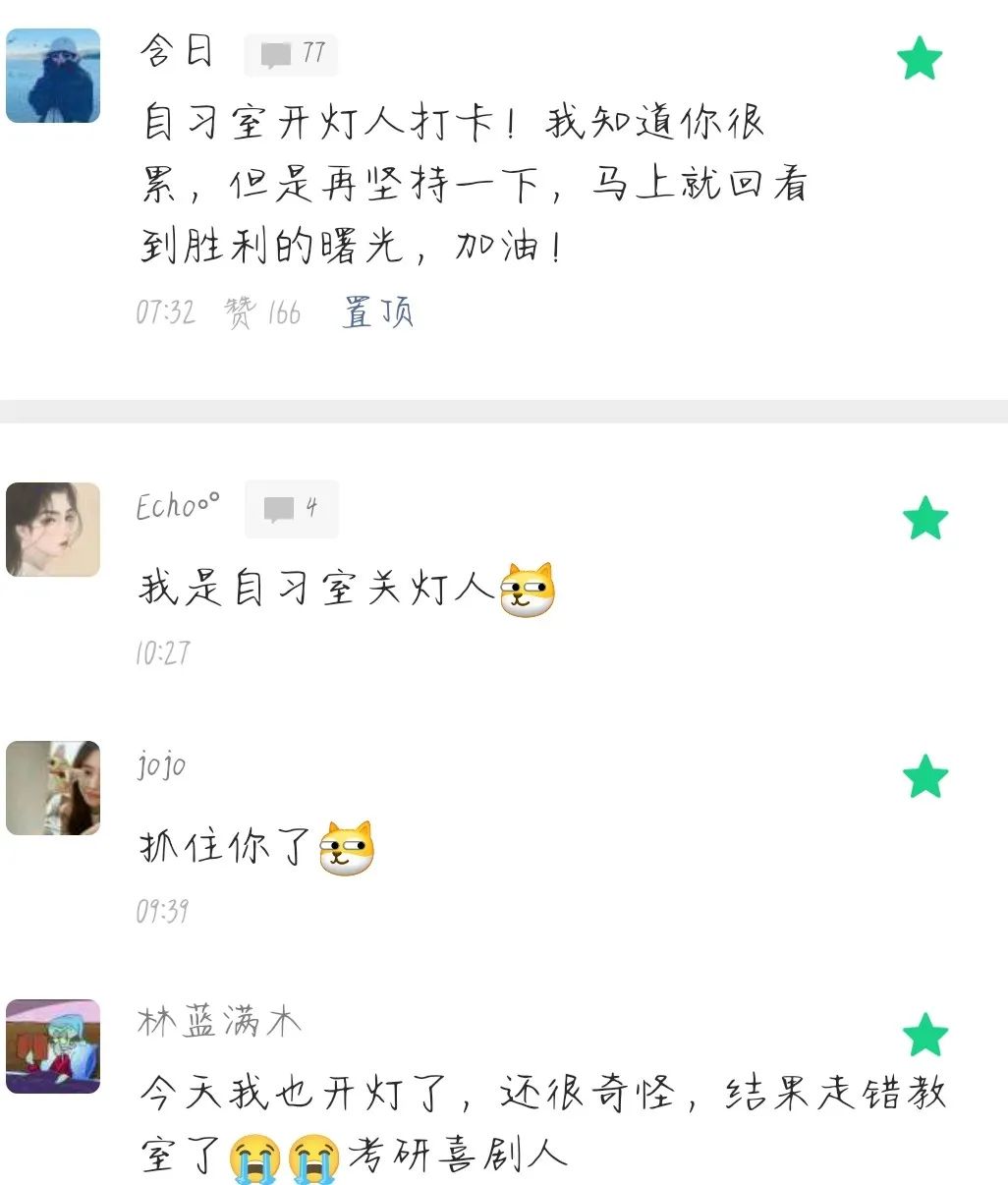 最近在评论区的留言中学到了一个很新的名词【自习室开灯人】,俗称每天最早去自习室开灯学习的考研人。