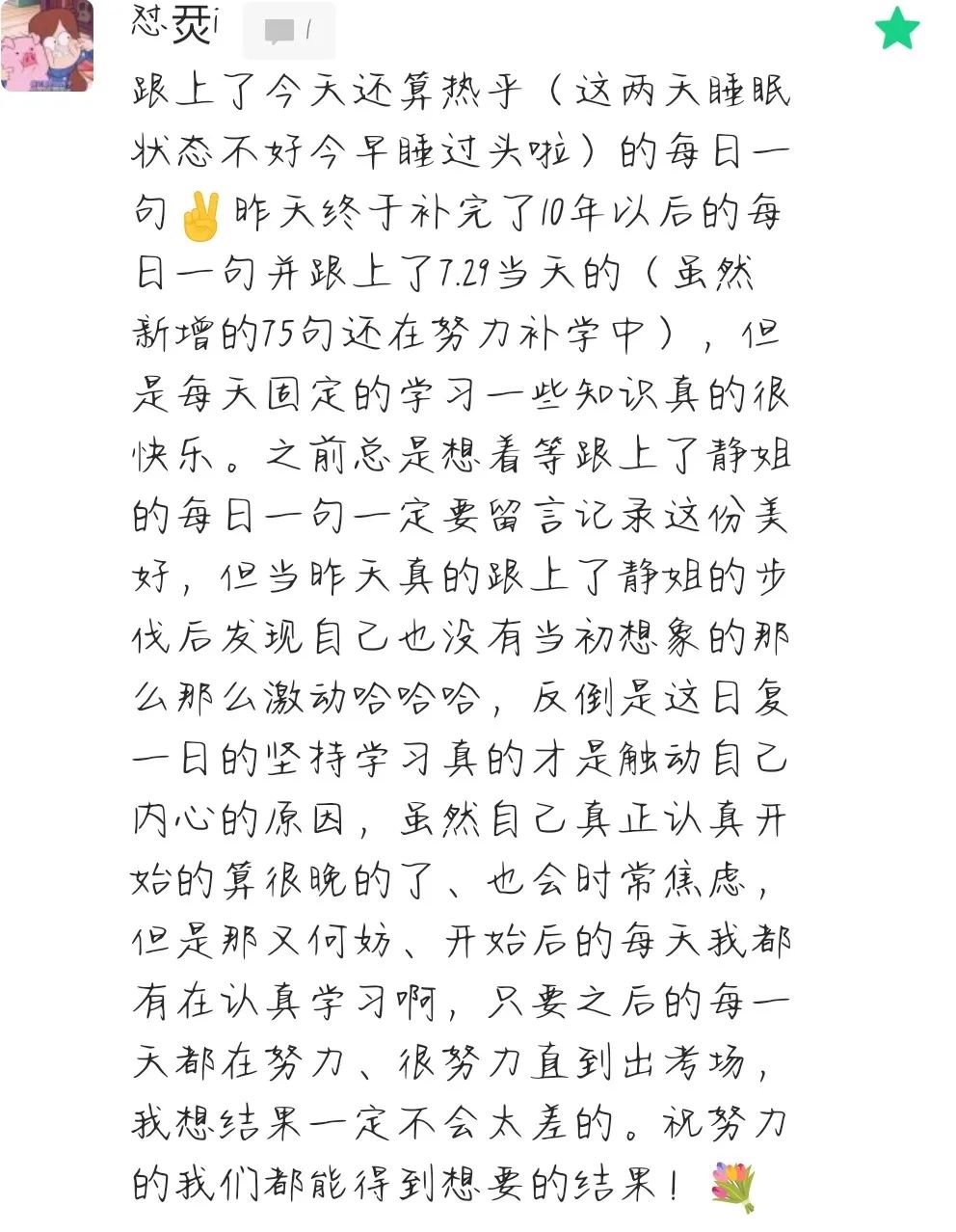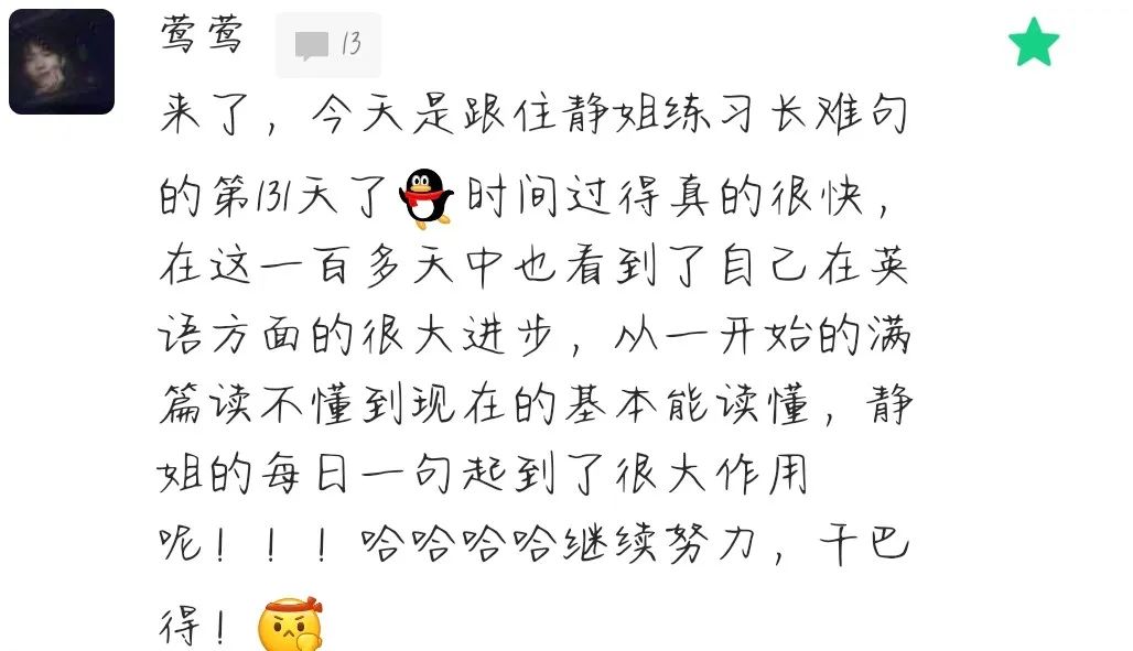 Aloha,大家好,我是大家的考研英语老师田静。又来到长难句50句了耶,期待一下前面会有什么奖励等待着我们呢,从我们开始24考研带学的第一天到现在,有些同学是跟着静姐从第一天,一天不落的走到了现在,有些同学可能最开始干劲满满,后来因为各种各样的原因开始掉队。当然在这个过程中还有不断加入的新鲜血液,有人悄悄退场就有人不断涌入。首先静姐要给那些一如既往坚持到现在的宝子们掌声鼓励,最重要的是我们要对这些迎头赶上的田田圈们提出肯定和表扬。虽然开始的可能不如别人早,但是这些后来的同学凭借着自己的坚持和努力,真的用事实证明了什么叫【后来者居上】,所以悄悄掉队的同学们,一定一定要再次赶上来呀,只要坚持到最后,结果都不会太差的。
