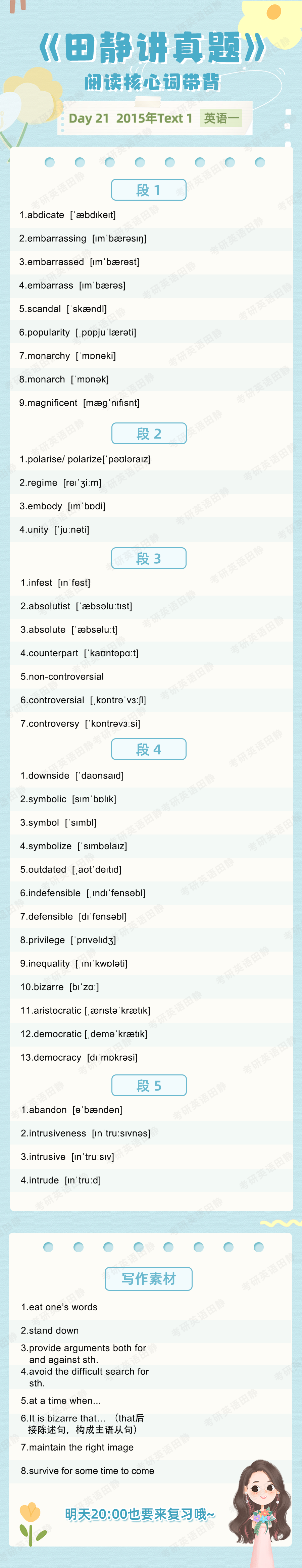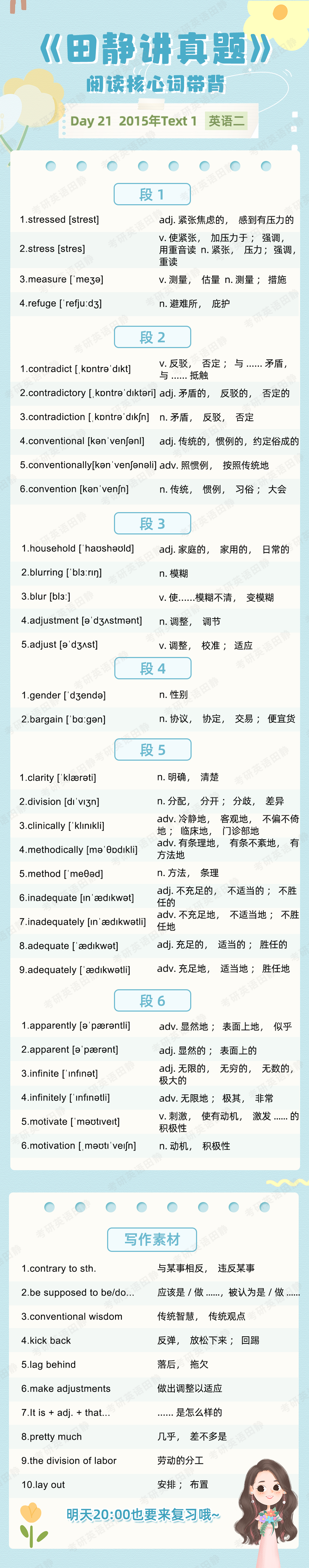 先复盘再学习,看看昨天的核心词带背都记住了吗,跟着静姐一起自测一下吧,没记住的单词记得标记出来📌,和今天新的单词一起背诵呀~