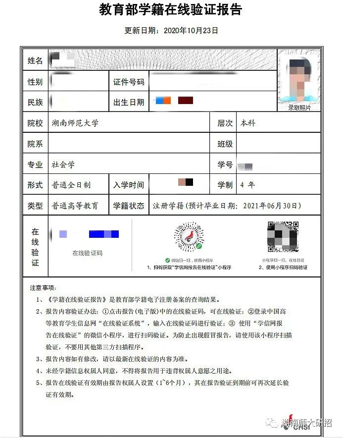 (2)“中国高等教育学生信息网”下载的《教育部学籍在线验证报告》