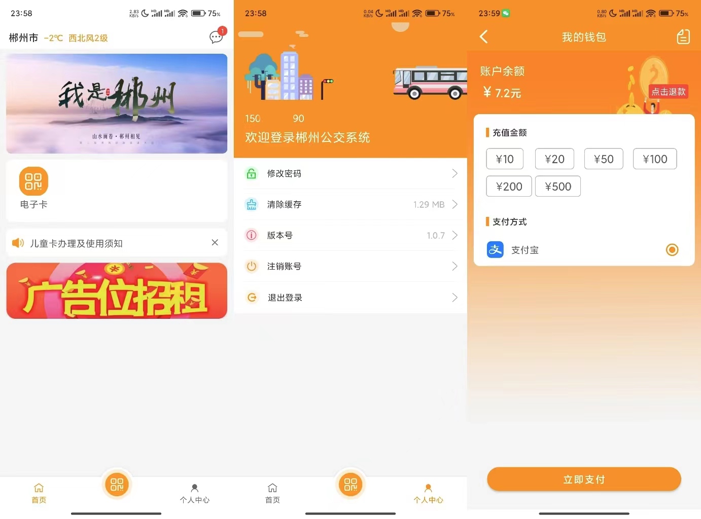 注意:首次使用需要注册登录。添加公交卡需要身份证实名认证,同时需要往钱包里面充钱(目前仅支持支付宝充值)。