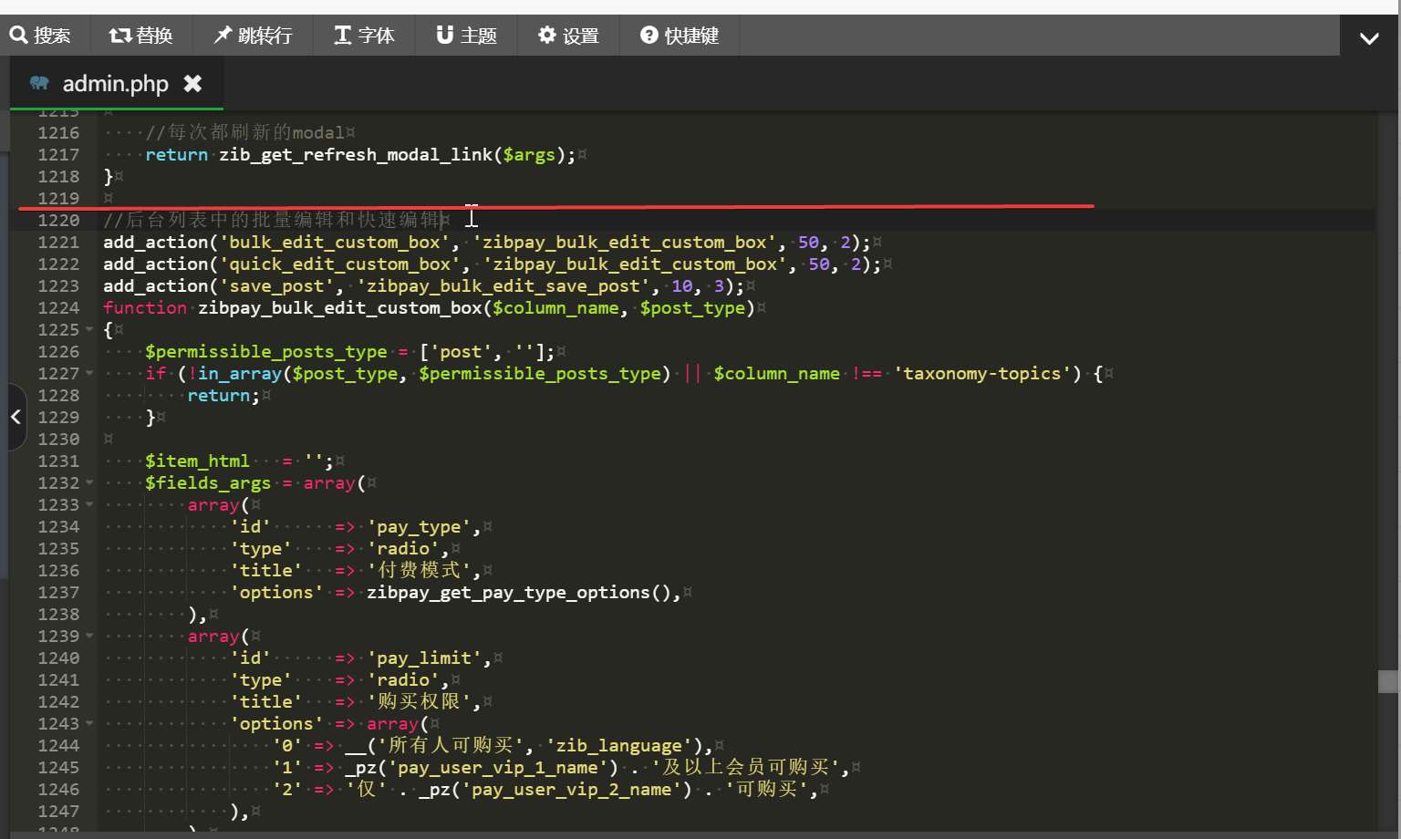 2.定位到“//后台列表中的批量编辑和快速编辑”(约1220行),从该行开始选择,一直到“//批量编辑保存”上一行(约1374行)结束,然后删除并保存。