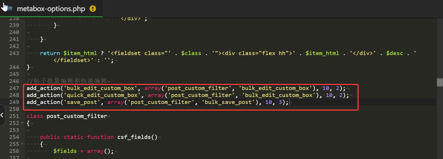 4.同理,如果要删除右边的“高级筛选”,可以打开该目录:wp-content/themes/zibll/inc/options/metabox-options.php。然后注释(或删除)第247-249行(如下图)。