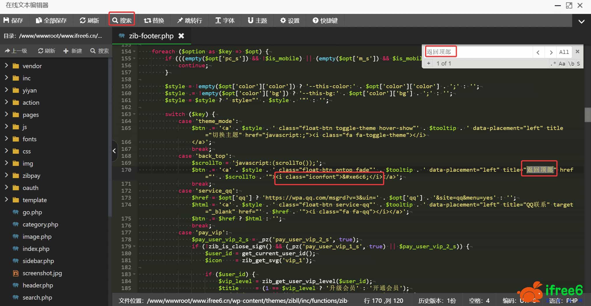 2.打开宝塔后台,进入网站根目录,使用宝塔后台的“文件内容查找”工具,搜索“返回顶部”或该div的类名,定位到相应位置,并将原来的i标签替换成“<i class="iconfont"></i>”。
