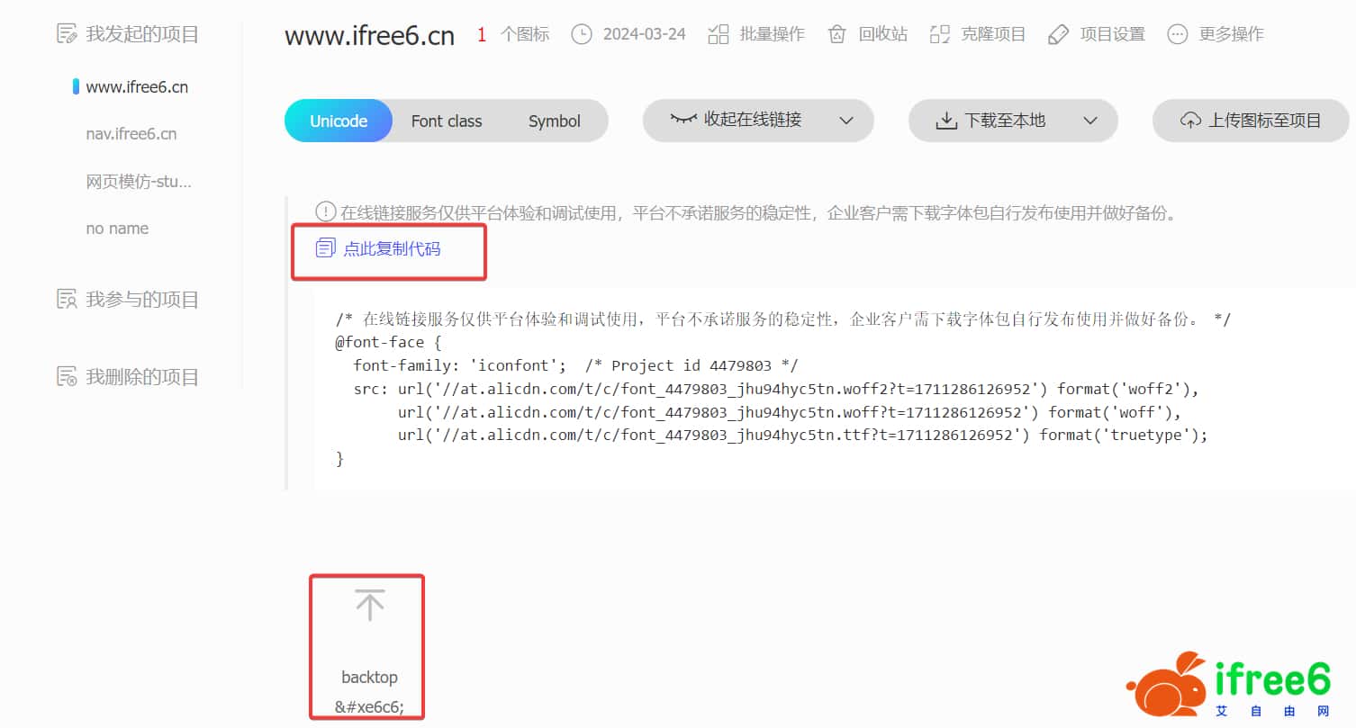 3.进入阿里矢量图标库官网(点此跳转),搜索你喜欢的图标,并添加进项目中(需登录),点击生成Unicode代码,然后将其复制、粘贴到你网站的CSS样式表中,如style.css或主题的自定义代码中(推荐)。