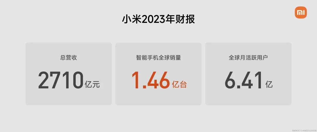 我们前不久发布了 2023 年财报,和大家分享几组数字:我们的智能手机全球销量高达 1.46 亿台,已连续 14 个季度稳居全球前三。全球正在使用小米手机和小米平板的用户数量,达到了 6.41 亿。全球用户的支持,为小米汽车未来的发展奠定了良好基础。