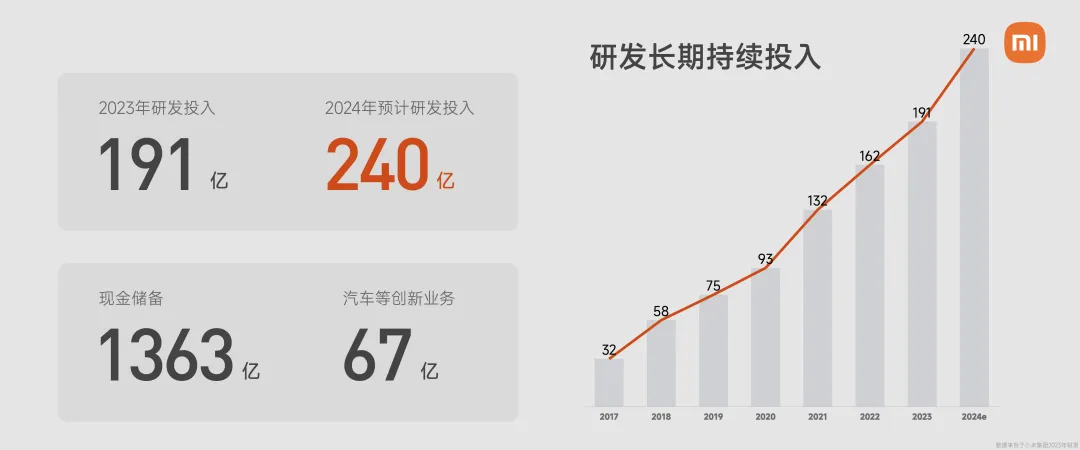 2023 年,小米在研发上的投入高达 191 亿,预计 2024 年达到 240 亿。在汽车等创新业务上,小米去年投入了 67 亿,我们是用真金白银来表达认真造车的态度(不包含与智能电动汽车等创新业务相关的股票薪酬费用)。