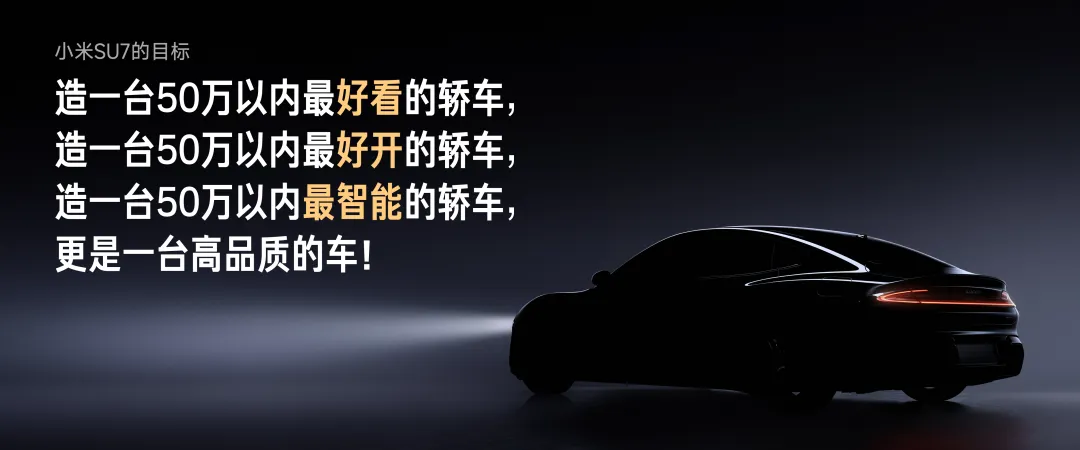 我们的目标是要造一台 Dream Car,梦想之车。这个时代的 Dream Car,必须要有最先进的智能科技,还要有最出色的驾驶质感,两者缺一不可。所以,我们希望把第一辆车打造成:50 万以内最好看的轿车、50 万以内最好开的轿车、50 万以内最智能的轿车,同时,还必须是一台高品质的轿车!小米SU7 ,就是我们为朋友们打造的梦想之车!