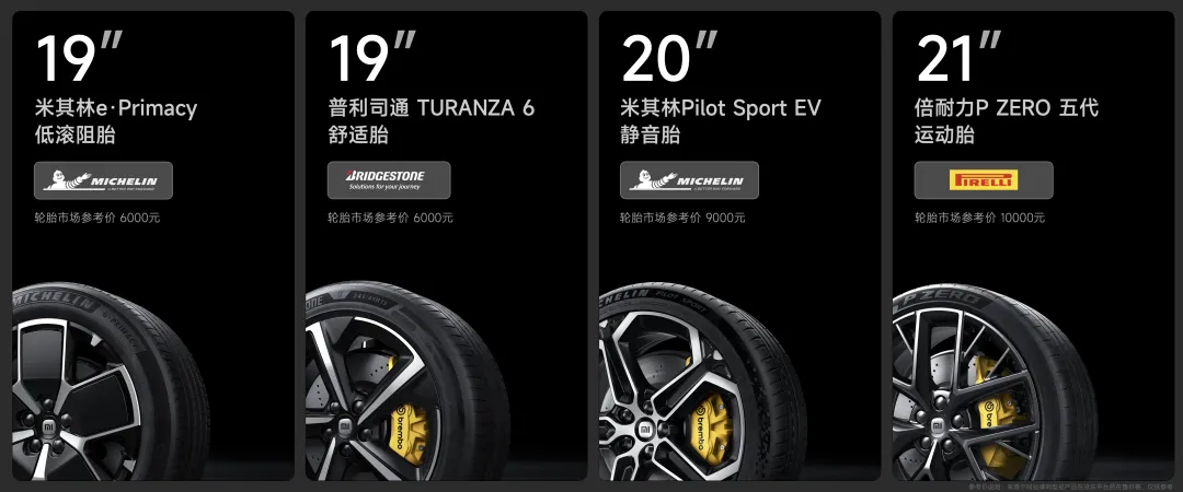 小米SU7 系列轮毂有 19 英寸、20 英寸和 21 英寸三种可选。还专门定制了 4 款轮胎,均来源于全球顶级品牌,特别是 21 英寸倍耐力第五代 P ZERO 轮胎,性能非常出色、抓地力特别强,能够很好的支持小米SU7 Max 版 2.78 秒的零百加速和 33.3m 的百零制动距离。