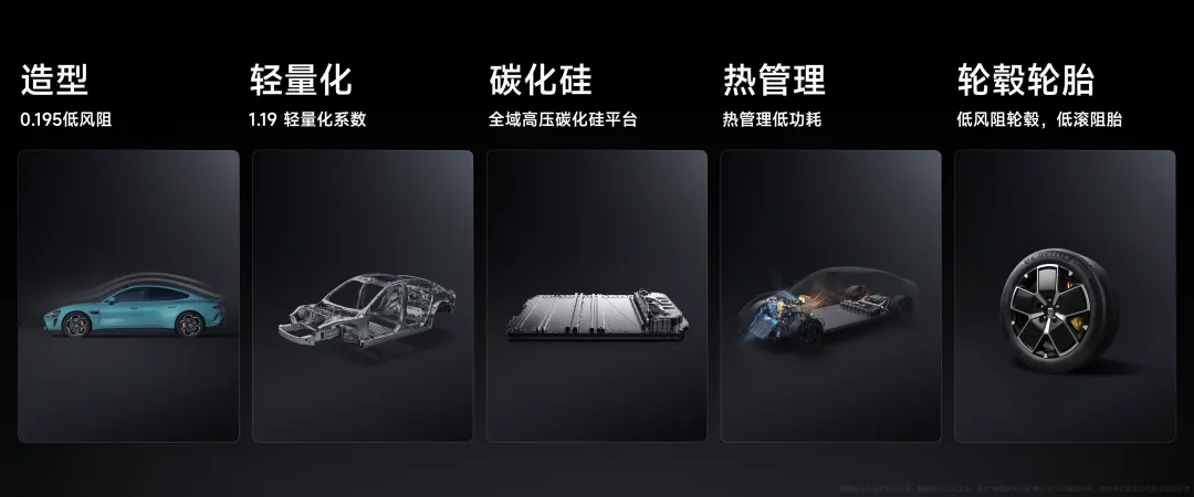 体验升级的背后,是满满的技术实力:极低的风阻系数、车身轻量化、全域碳化硅、低能耗设计的热管理、低风阻轮毂和低滚阻轮胎,综合在一起,才能实现出色的续航表现。