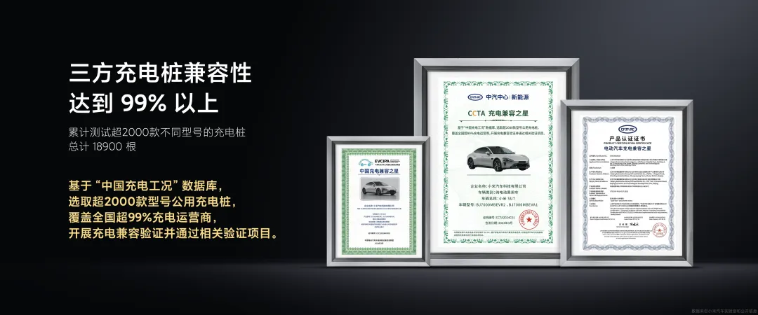 还有一点非常重要的,是“不挑桩”,我们做了全国大规模路测,测试了 148 家 2000 多款充电桩,充电次数超过 7.03 万次,解决超过 500 个充电故障,提高了整个行业公用桩的充电体验。经过三家认证机构评测,小米SU7 的三方充电兼容性到达了 99% 以上,我们是目前行业里已认证充电兼容性最高的电动车!