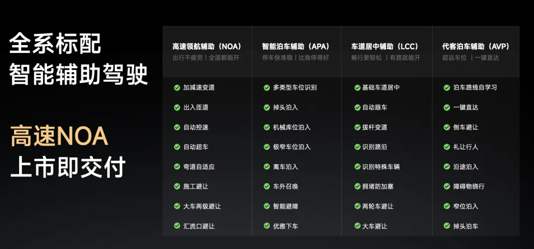 小米SU7 全系标配智能辅助驾驶,上市即交付高速领航,全国都能用。目前,我们已经把全国所有的高速公路都跑了一遍,小米SU7 能做到 300 公里完全接管不到 1 次,急加速或急刹,100 公里都不会出现 1 次。此外,我们还支持代客泊车辅助、智能泊车辅助、机械库位(极窄车位)泊车。
