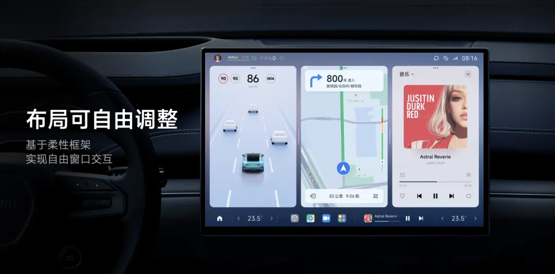 一开机,精致的 3D 车模映入眼帘,滑动与拖拽的体验非常流畅、丝滑,还可以精准还原车辆当前状态。你可以在这块屏幕上直接打开尾翼、打开后备厢、调节悬架、检查胎压等。这套车机系统还拥有先进的柔性框架,支持自由调整窗口大小和布局,特别方便。