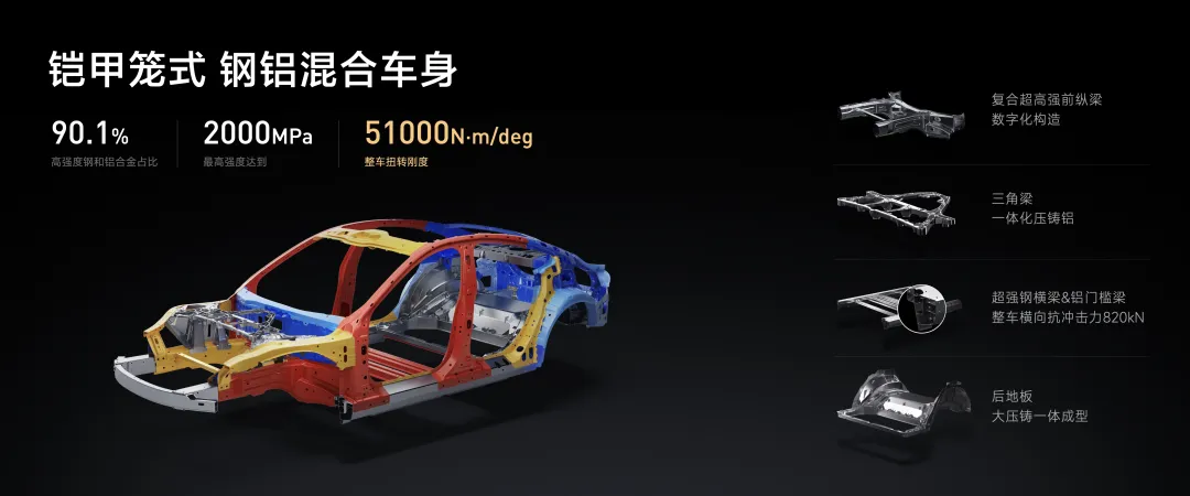 小米SU7 采用铠甲笼式钢铝混合车身,90.1% 高强度钢和铝合金占比,最高强度达 2000MPa,与潜艇所用材质的强度相当。此外,扭转刚度高达 51000N·m/deg。车内一共有 7 个安全气囊;2 个 2.04 米超长侧气帘,还有远端气囊,全面保护前后排乘客。