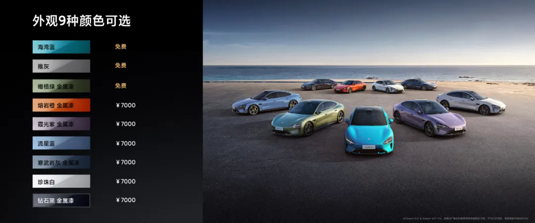 在去年年底小米汽车技术发布会上,我们发布了小米SU7 的 3 款颜色:海湾蓝、橄榄绿、雅灰,受到了很多米粉的喜爱。这次再发布 6 款全新颜色,共计 9 款,分四个色系,分别是:跑车色系、时尚色系、豪华色系和经典色系,其中有 5 款是金属漆,充分满足大家的个性化需求。