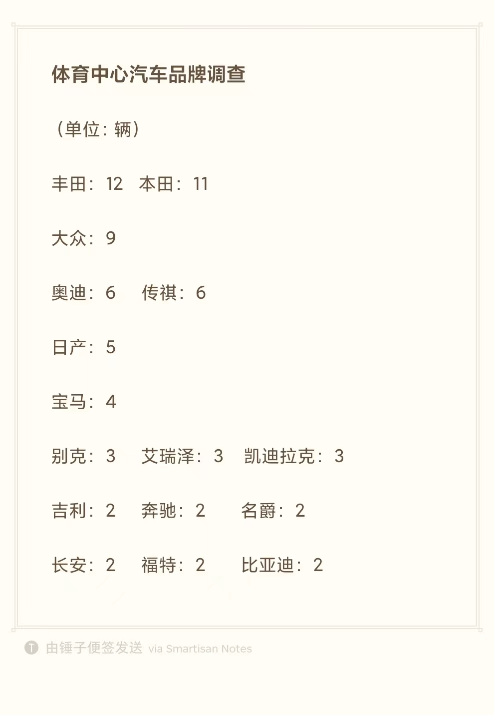 然后,在骑行过程中,就看到沿途停放的小汽车,我闲得无聊,心里想知道现在究竟哪个品牌的车子比较热门?于是就简单统计了一下。日系车居然霸占了前两名,其次是大众汽车,国产车还是比较少。我发现郴州的一些警车也是“广汽传祺”。