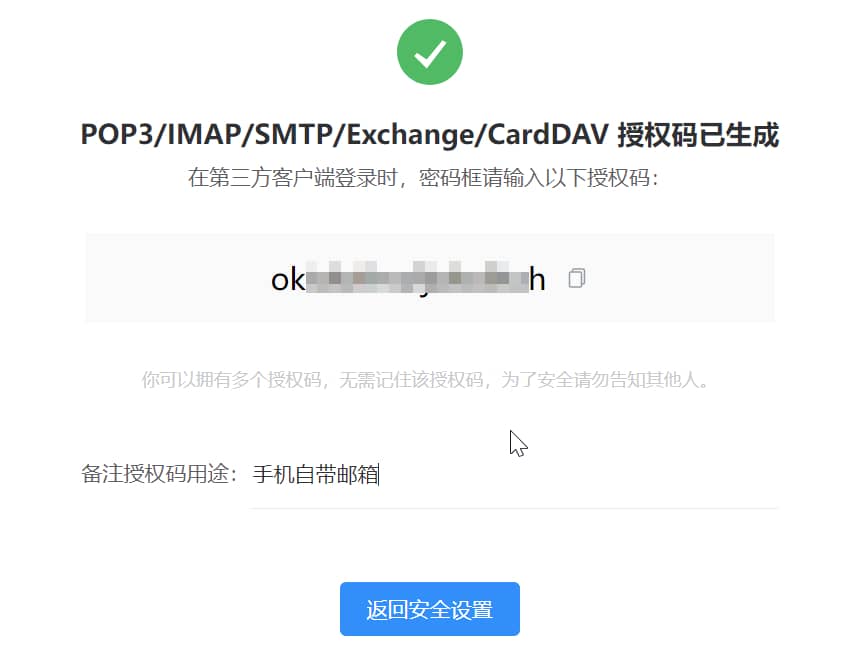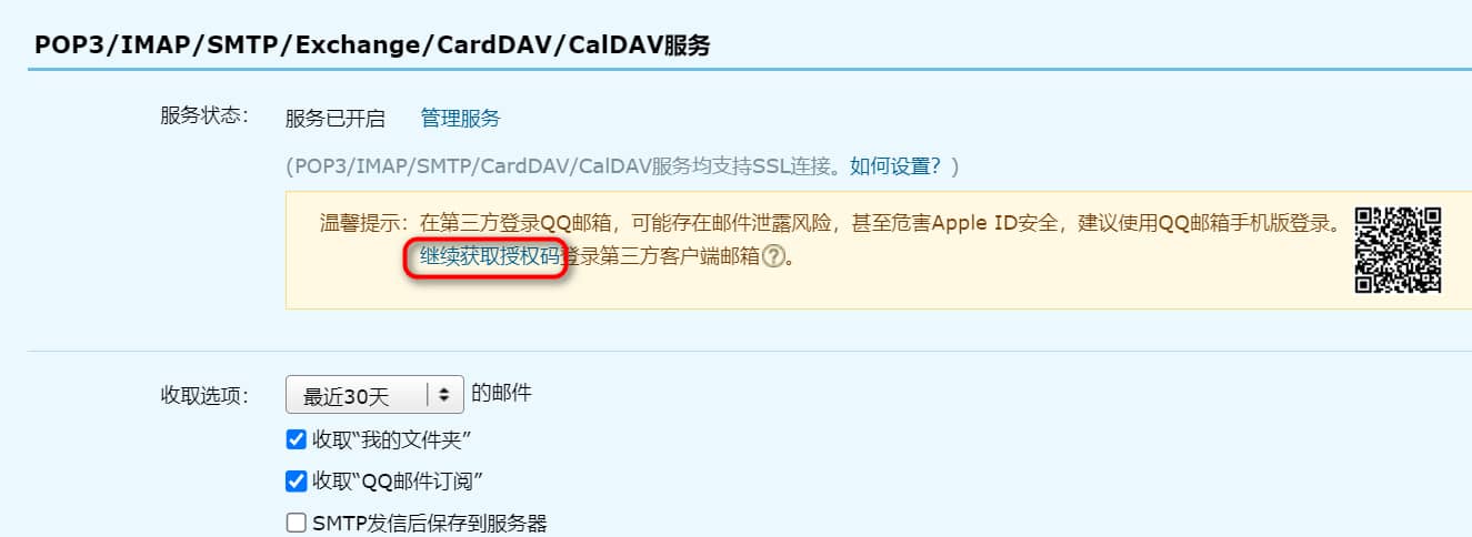 开启 “POP3/IMAP/SMTP/Exchange/CardDAV 服务”(如果已开启,可忽略),然后点击【继续获取授权码】,它会弹出一个验证界面,按照提示发送一条短信(要用邮箱绑定的手机号)后,即可获取授权码。