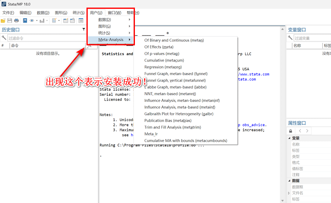 (4)可选,如果你要做meta分析,那么可以继续配置第二个文件。首先打开stata软件的安装目录(不是打开stata软件),将“win外部命令中”的“profile.do”文件复制到stata软件安装目录下,再将“personal”和“plus”文件复制到stata软件安装目录的“ado”目录里。重新打开stata18软件,顶部菜单“用户”中出现“Meta-Analysis”表示安装完成!