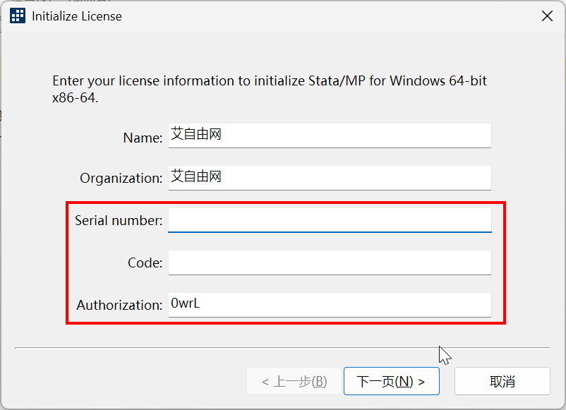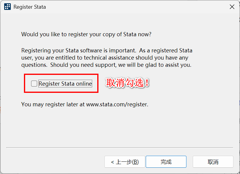 6.相关说明:(1)网盘里有两个文件(一个是“stata18”本体,另一个是“win外部命令-就是meta分析的插件包,如果不需要可不下载”),下载后解压。(2)先安装第一个文件里的“SetupStata18.exe”,保持默认配置就行(选择StataMP),要填东西的可随意填写。(3)在开始菜单中找到已安装的“StataMP 18”软件(没找到可以按“win+s”搜索)并打开,在弹出的窗口中填入激活码(如下图,红框中的内容可在第一个压缩包中找到),然后取消勾选“Register Stata online”,点击“完成”,此时会弹出“检查更新”窗口,选择“禁止自动更新检查”,确定即可,此时stata软件已经激活了。
