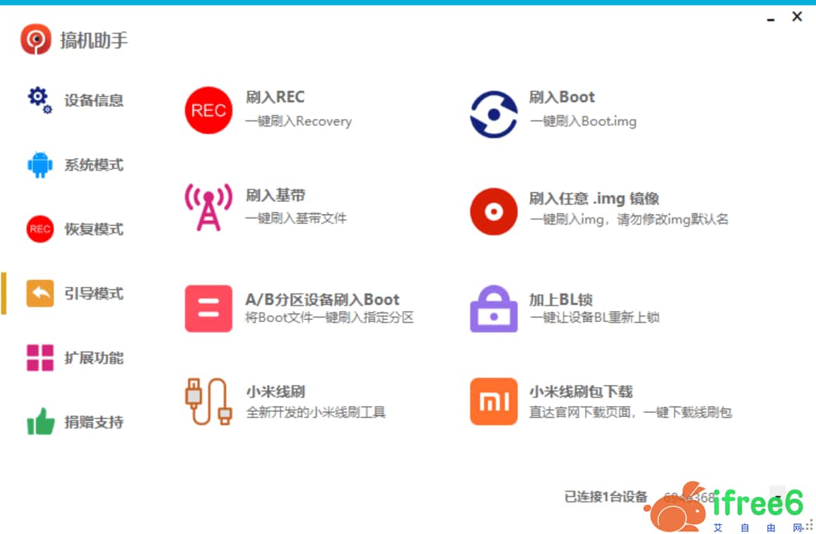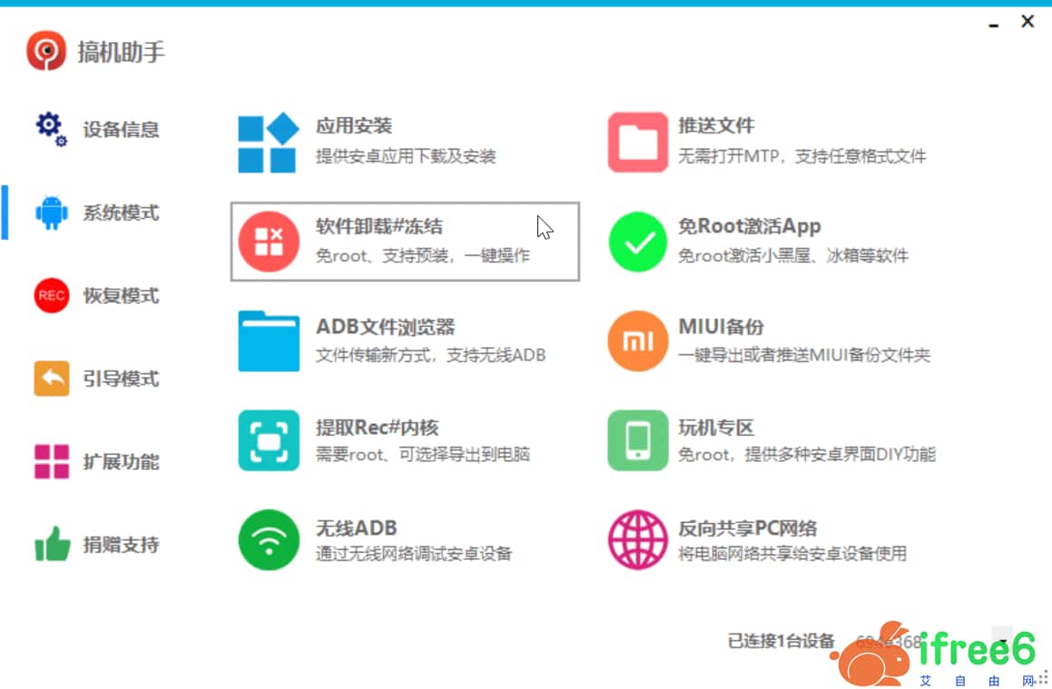 主要功能:Twrp recovery全自动刷机,免Root冻结、卸载预装软件,免Root激活,反向共享PC网络,刷入Recovery,小米线刷,无线ADB连接,Sideload刷机,ADB文件浏览器,应用下载及安装,推送任意格式文件等,更多功能和玩法等你来体验。