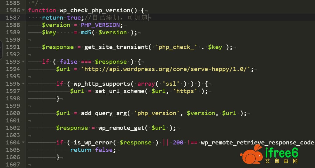 代码位置:wp-admin/includes/misc.php(搜索“wp_check_php_version”,定位到如图位置,不同版本WP位置略有差异)