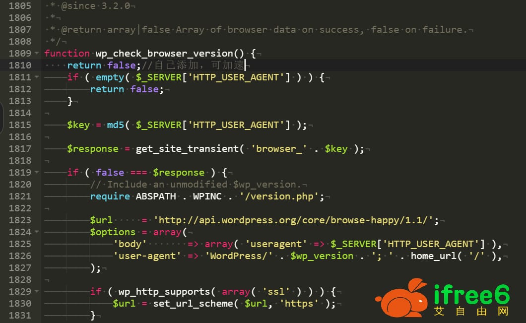 代码位置:wp-admin/includes/dashboard.php(搜索“wp_check_browser_version”,定位到如图位置)