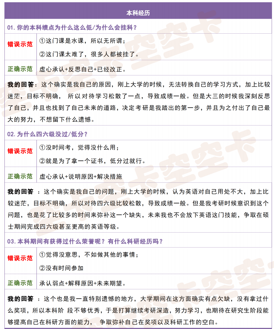 本节包含三方面内容(本科经历、考研初衷、学术道路),主要是一些考研复试中常见的刁难问题以及正确和错误的回答示范。主要讨论本科生期间的荣誉称号和科研经历问题,涉及四六级成绩以及本科阶段低分或未通过的情况,最后是关于选择专业和是否继续读博的问题。