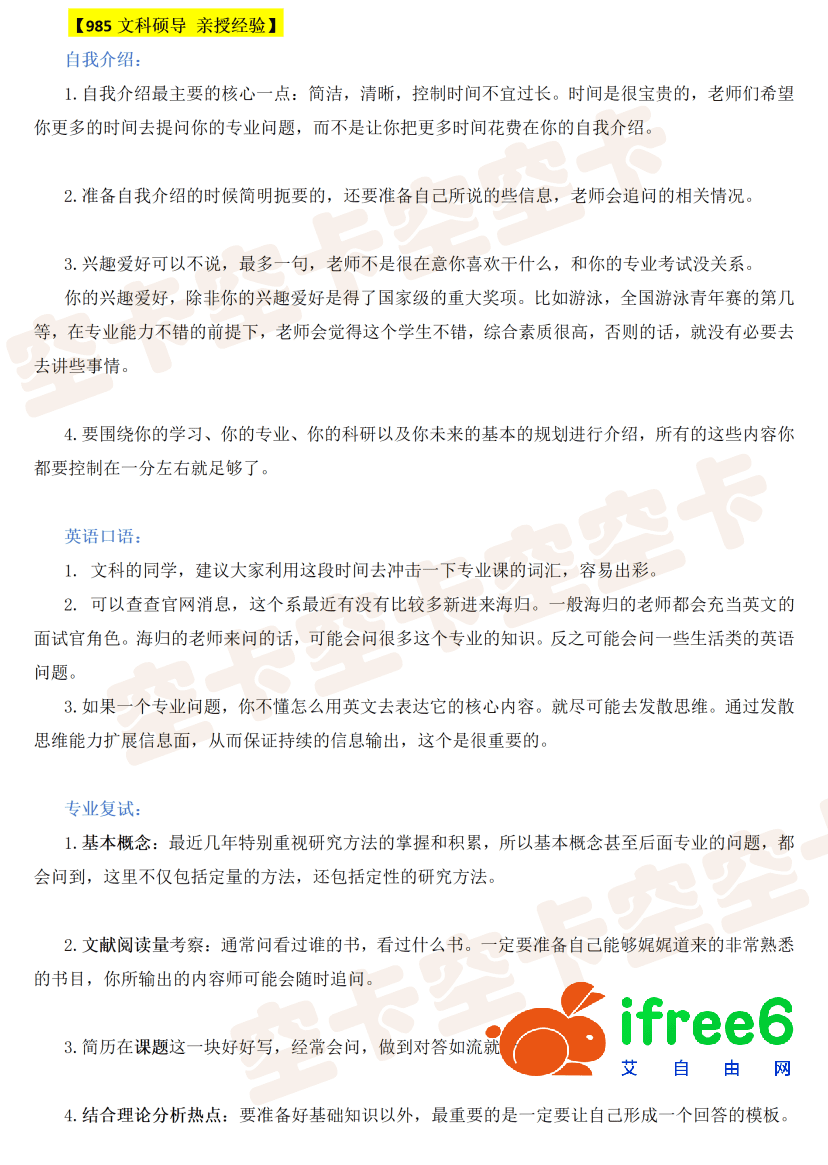 【考研复试课】12硕导亲授经验小艾同学2024年12月3日发布关注私信01000 课程简介 本节课包含一位985文科硕导和一位211理科硕导分享的一些复试经验。主要从自我介绍、英语口语、专业课复试3个方面来讲述。 课程视频与资料下载 隐藏内容,请登录后查看 © 注意事项 常见问题: 1.不会下载文件?答:请查看下载帮助。 2.我应该下载哪个文件/软件? 答:通常“数字后缀”表示版本号(越大越新),下载数字最大的即可! 3.下载地址为什么隐藏了? 答:防止爬虫索引,敏感内容登录即可免费下载! THE END复试指导 点赞0收藏