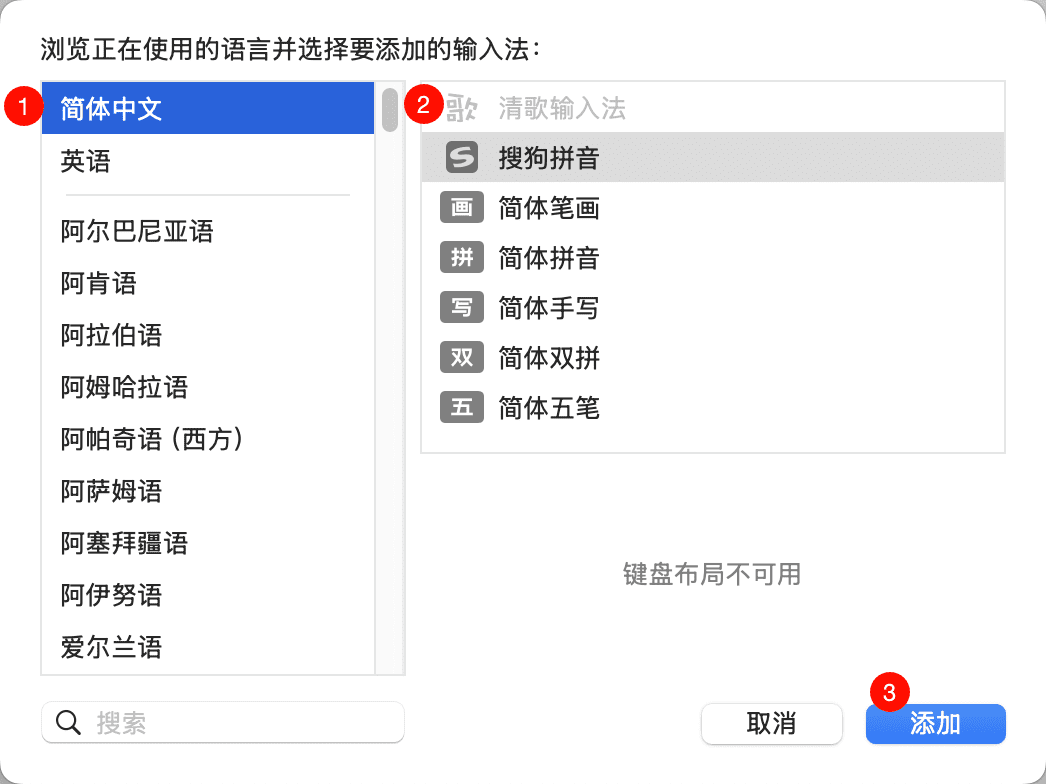 6.相关说明:①安装本输入法后,可能需要前往“系统设置”→“键盘”→“输入法”中,点击弹窗左下角的加号,然后手动添加【如下图】。