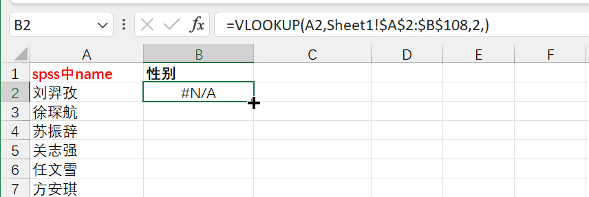 3.然后将该查找范围设为“绝对引用”(按F4键),公式为:【=VLOOKUP(A2,Sheet1!$A$2:$B$108,2,)】,按回车键。(下图显示为“#N/A”,是因为另一张表中没有此名字)