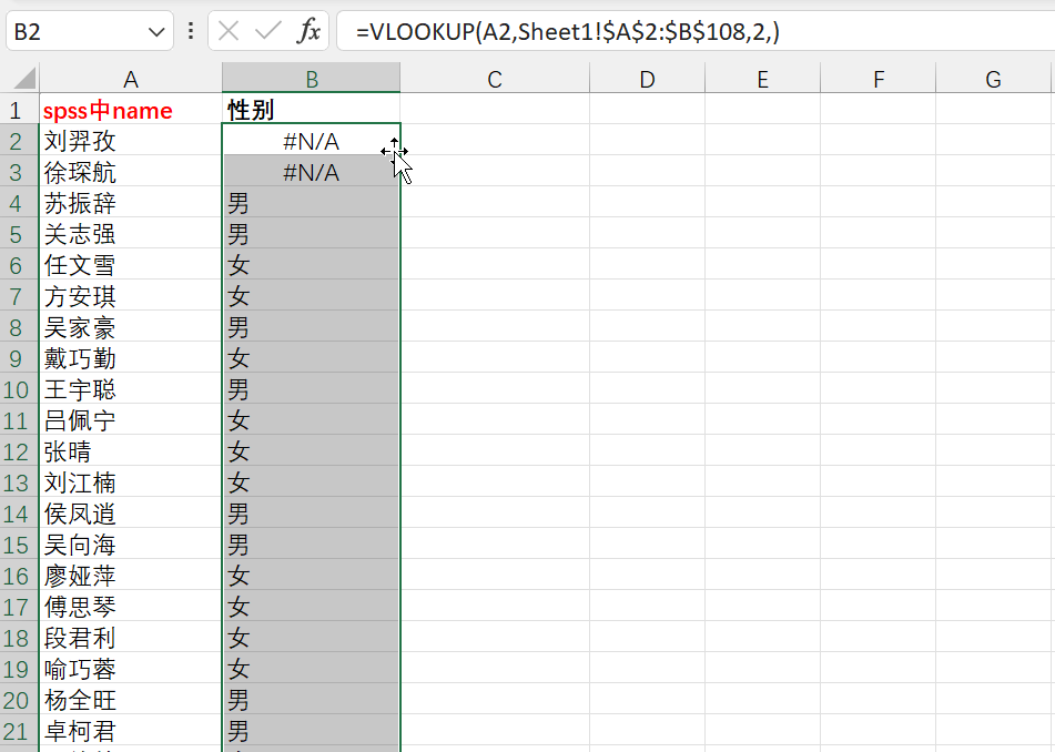 2.在 B2 中输入【=VLOOKUP(A2,Sheet1!A2:B108,2,)】;