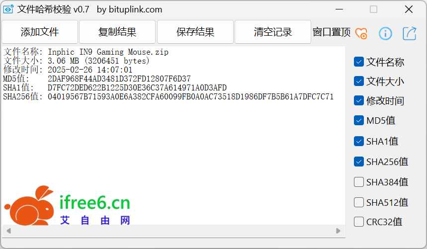 这是一个对文件进行 MD5、SHA、CRC 校验的小工具,支持拖拽,复制信息到剪贴板,以及另存文件,勾选输出项等特性,代码基于 aardio 开发。