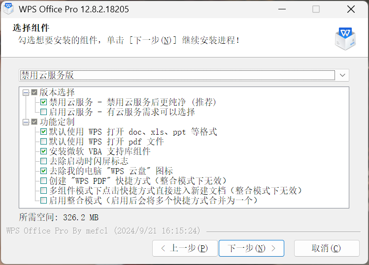 6.相关说明:软件安装时可自行决定启用或禁止云服务等不必要的组件(如下图)。推荐使用WPS 2019版。